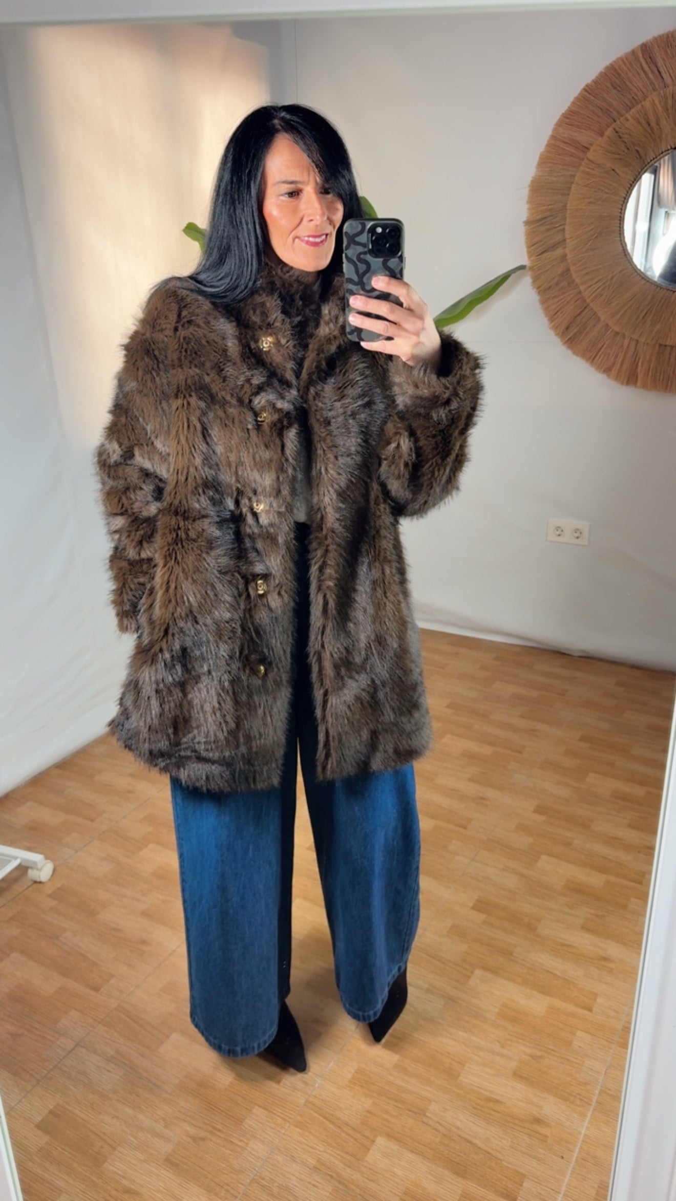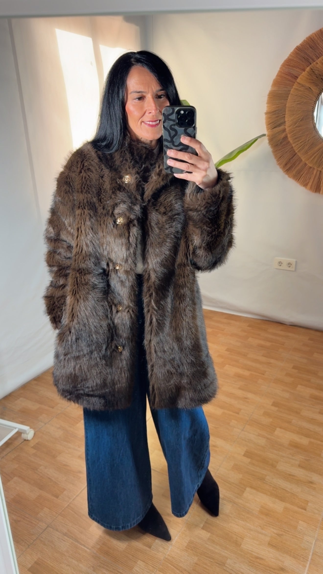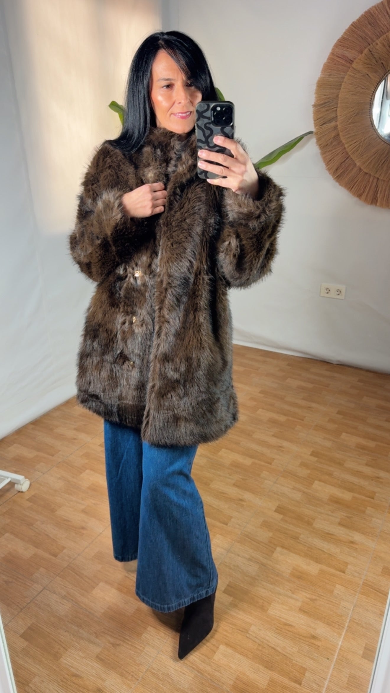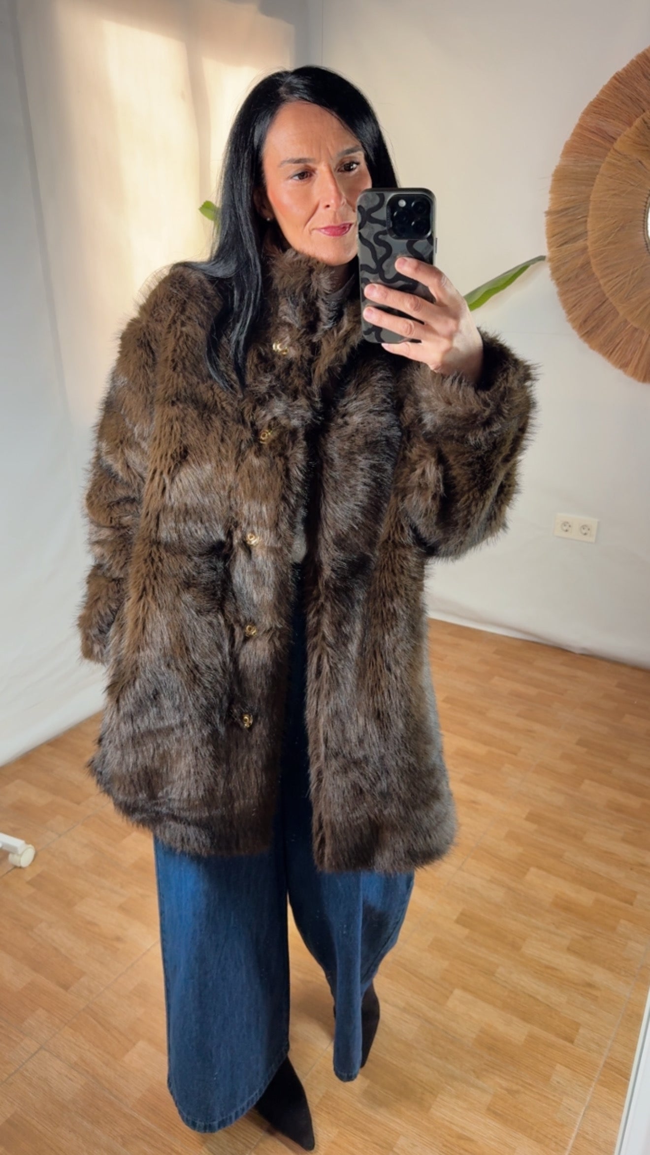 Talla única 38/44Eleva tu estilo invernal con nuestra pieza estrella de la temporada. Este abrigo de pelo sintético de alta calidad en tono marrón chocolate ofrece una textura ultra suave y un brillo natural que imita la sofisticación del visón clásico.