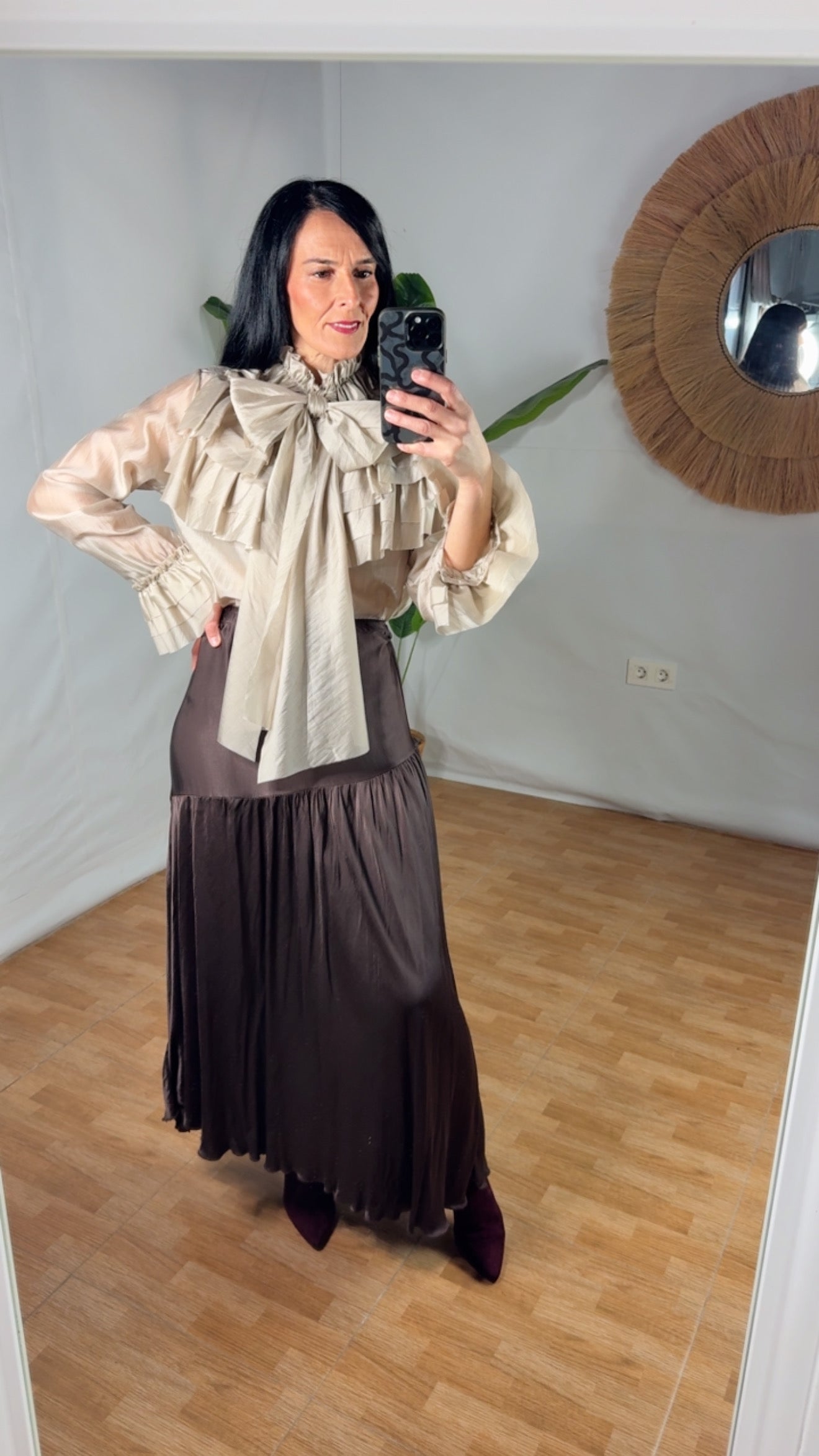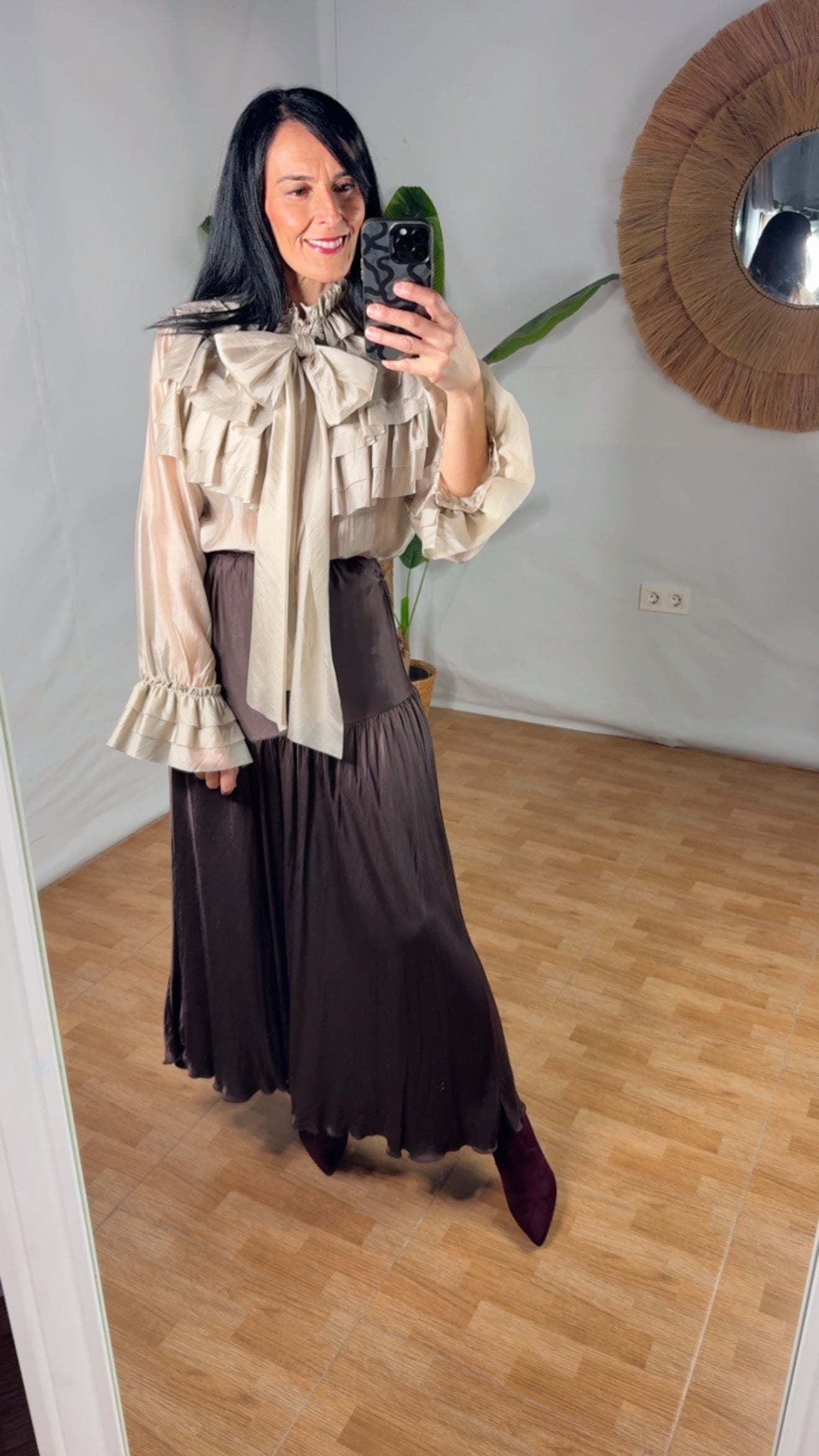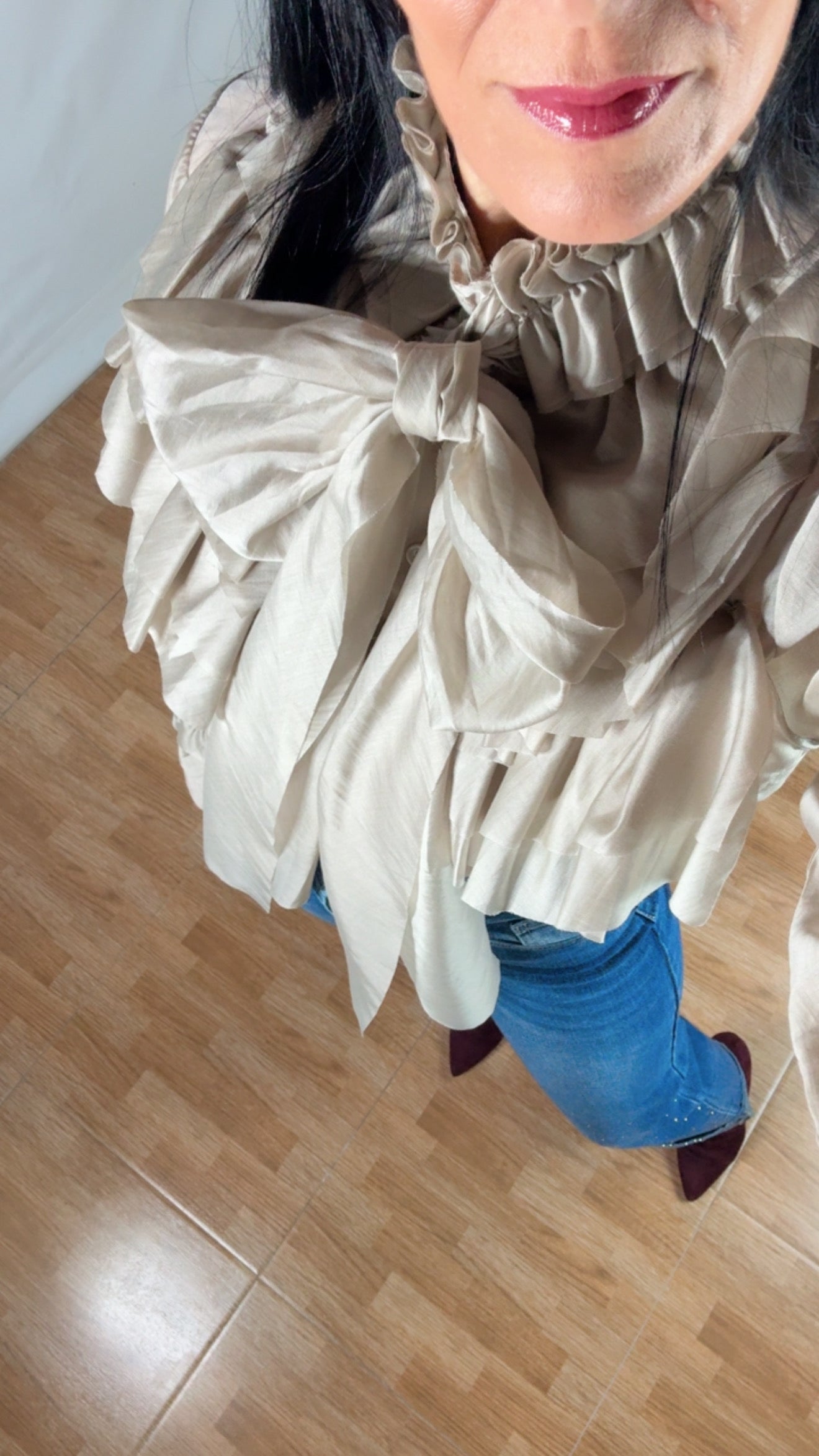 Eleva tu armario con una pieza que derrocha feminidad y carácter. Esta blusa, confeccionada en un tejido ligero con sutil brillo satinado, destaca por su imponente lazo al cuello y sus hileras de volantes plisados que aportan un volumen arquitectónico único.