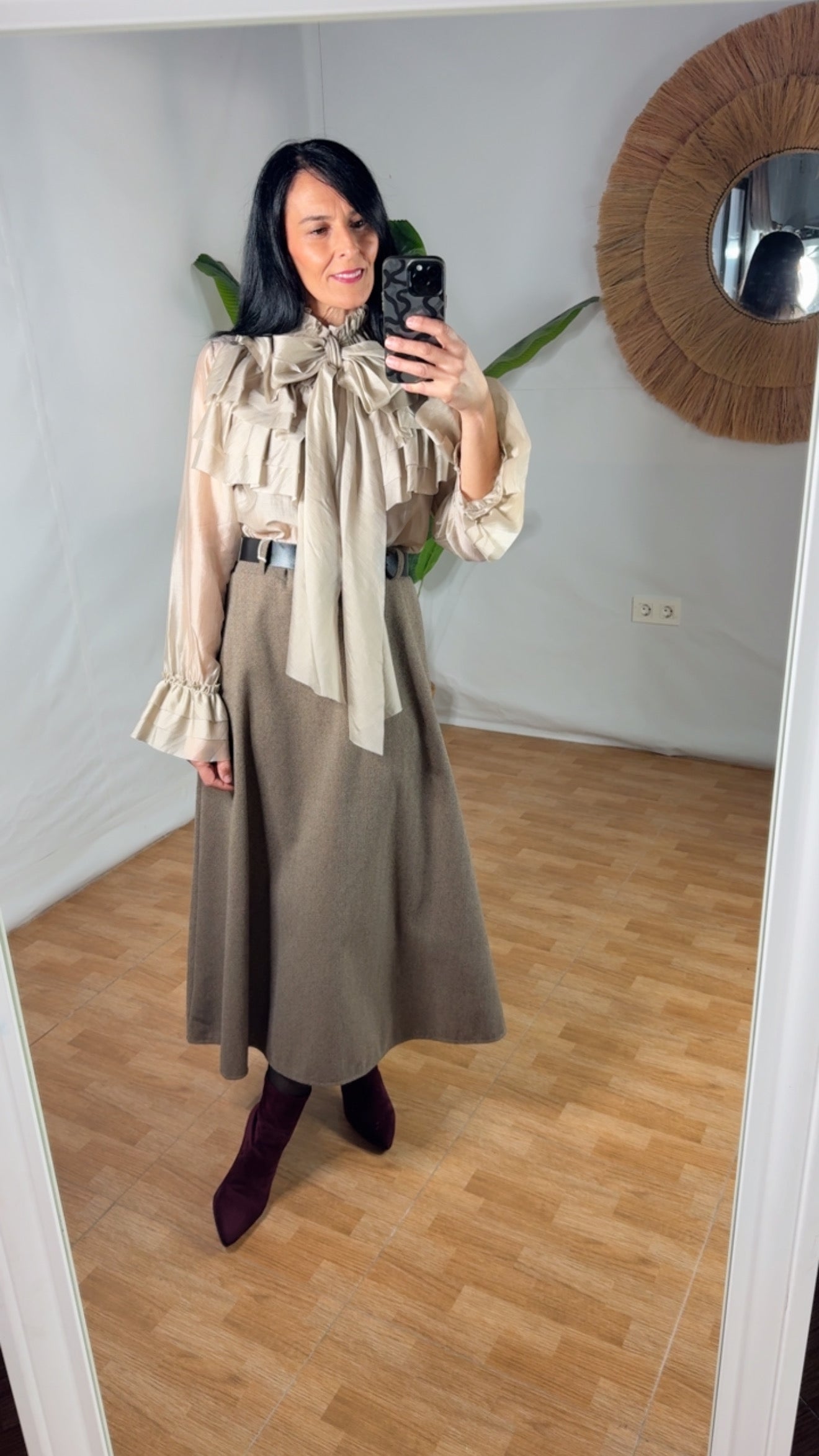 • Detalles clave: Cuello alto con lazada ajustable, mangas abullonadas con puños elásticos de doble volante y acabado traslúcido elegante.