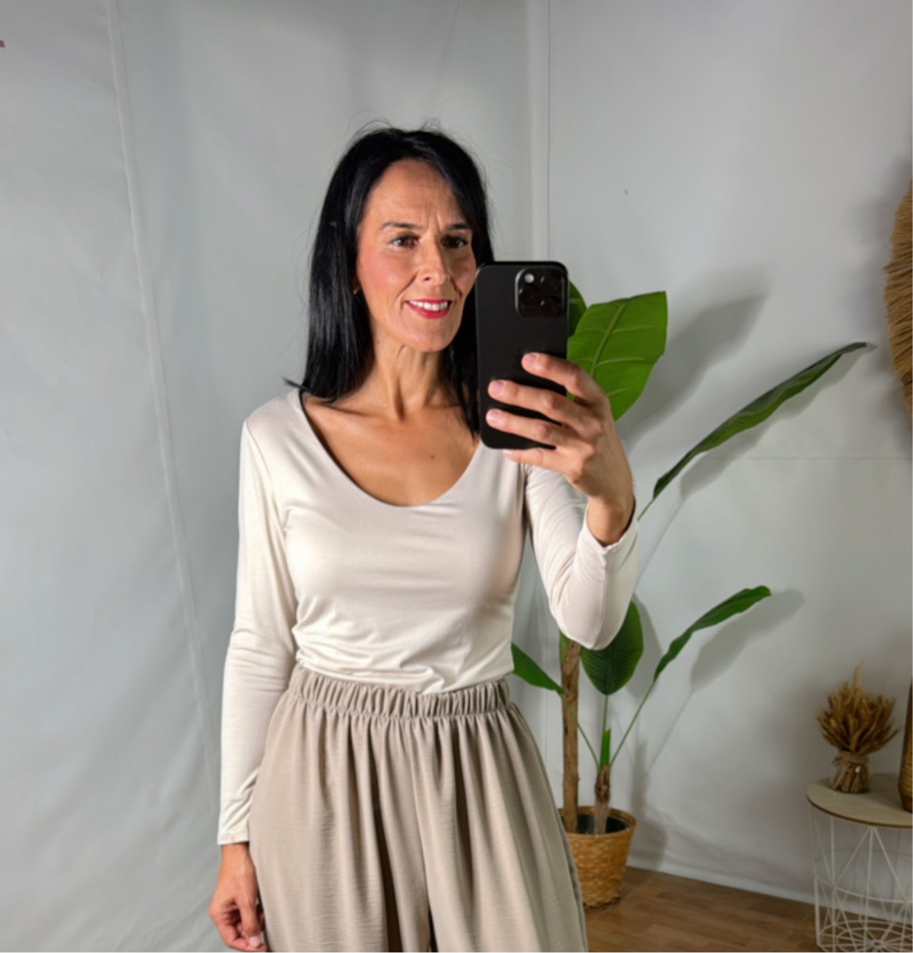 Un básico imprescindible: nuestra camiseta beige de algodón combina comodidad y estilo. Su tejido suave y ligero te acompaña todo el día, mientras su diseño sencillo encaja con cualquier look. Disponible en talla única, se adapta a las tallas 36 a 42.
