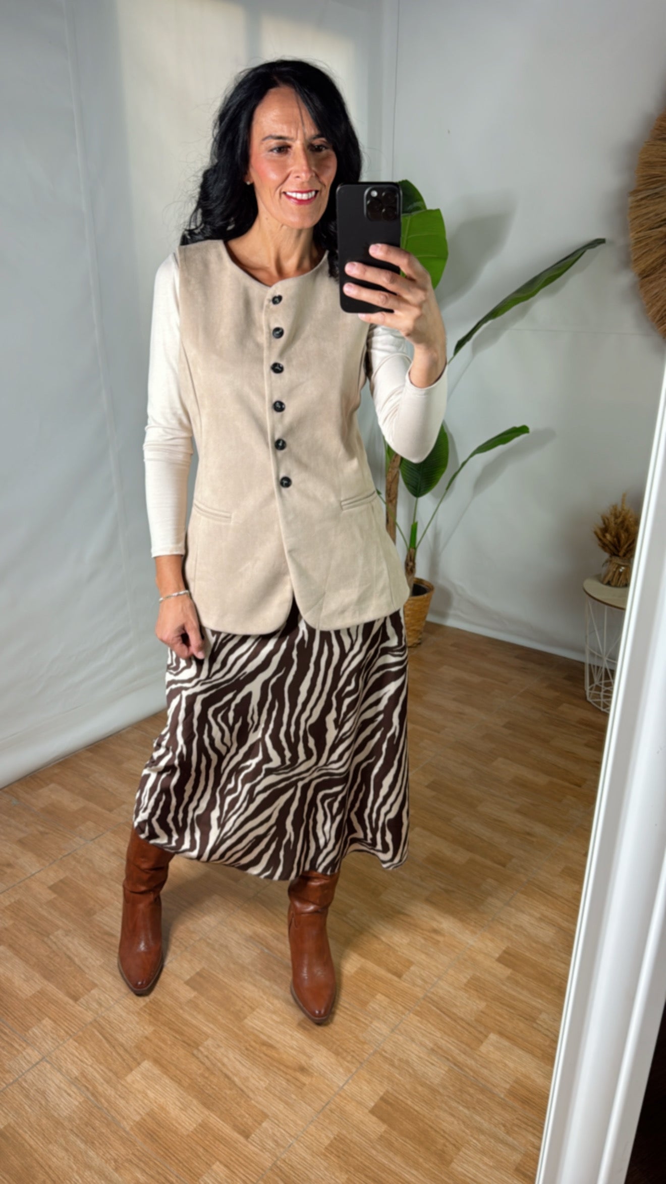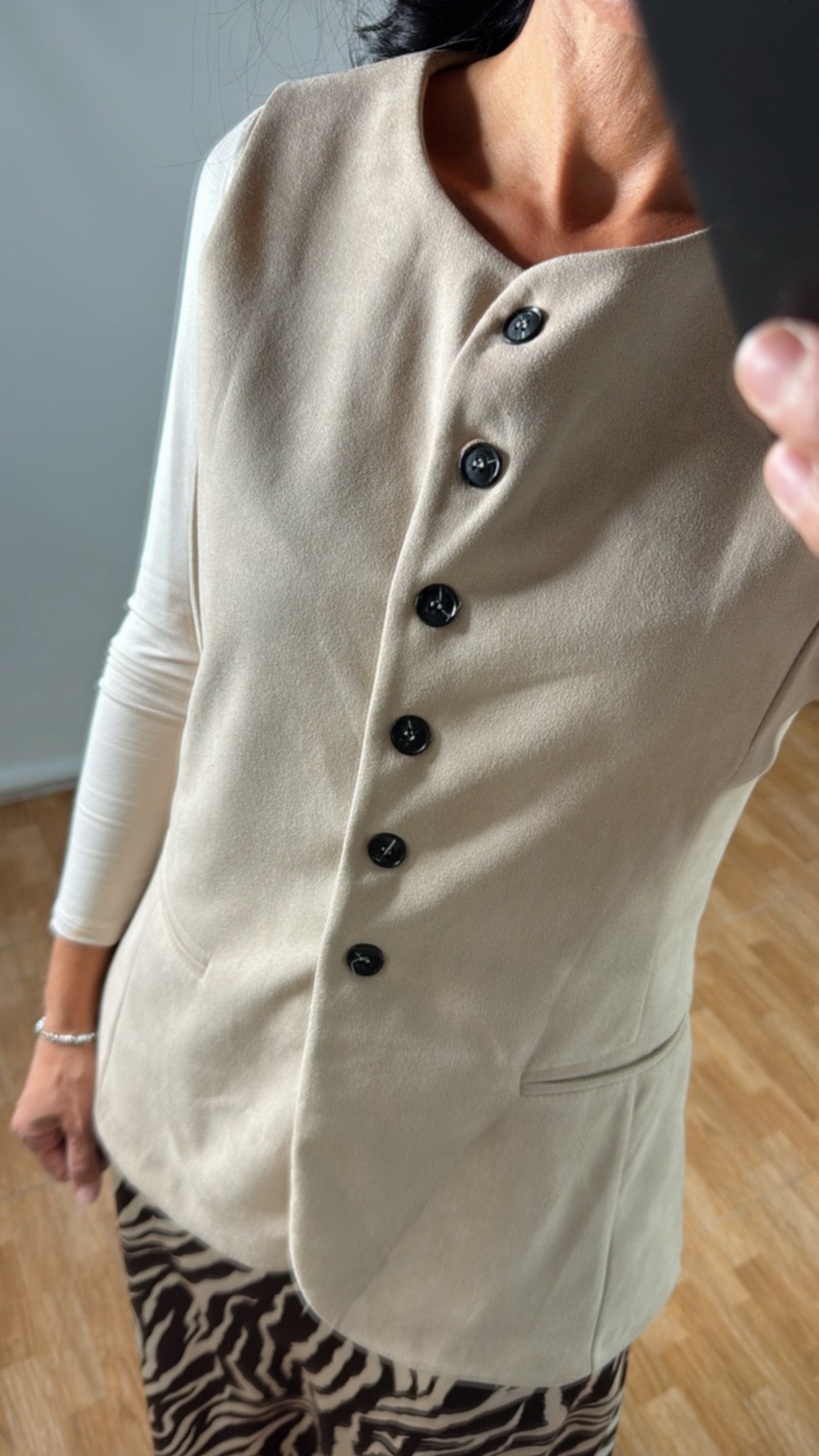 Chaleco de antelina suave al tacto, ligero y muy fácil de combinar. Disponible en dos colores básicos y atemporales: marrón y beige.