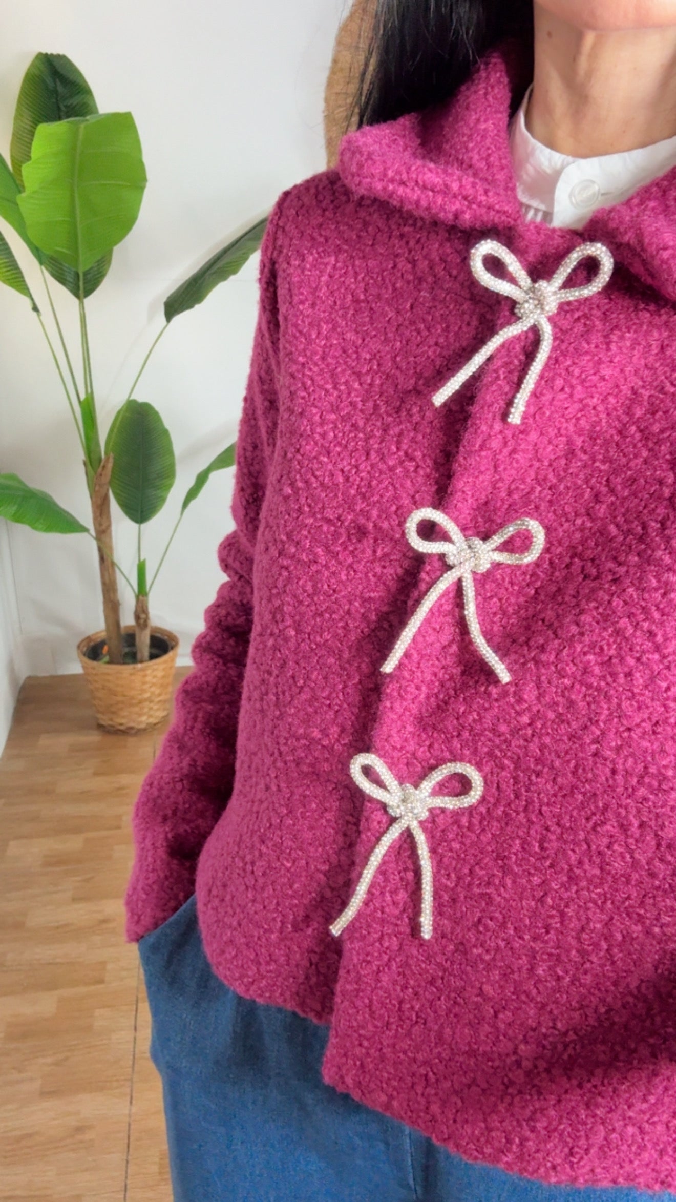 Chaqueta corta de tejido bouclé en tono burdeos, con un delicado cierre frontal de lazos decorativos. Su diseño femenino y sofisticado la convierte en una prenda ideal para elevar cualquier look, tanto de diario como de ocasión especial. Perfecta para combinar con pantalones de vestir o faldas.