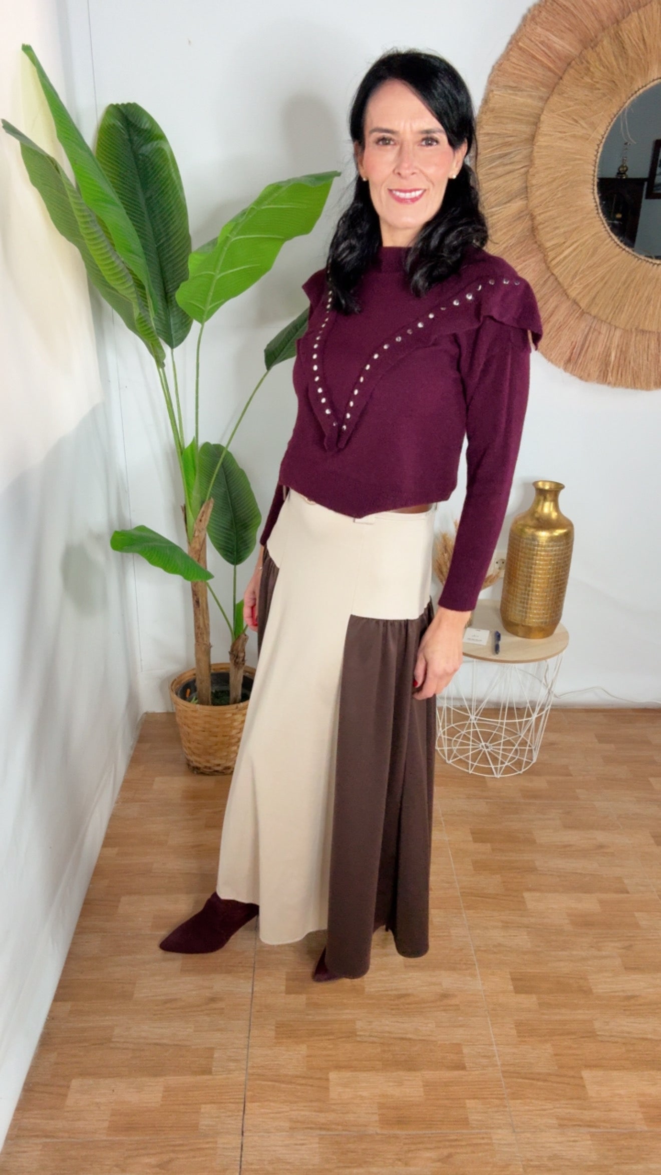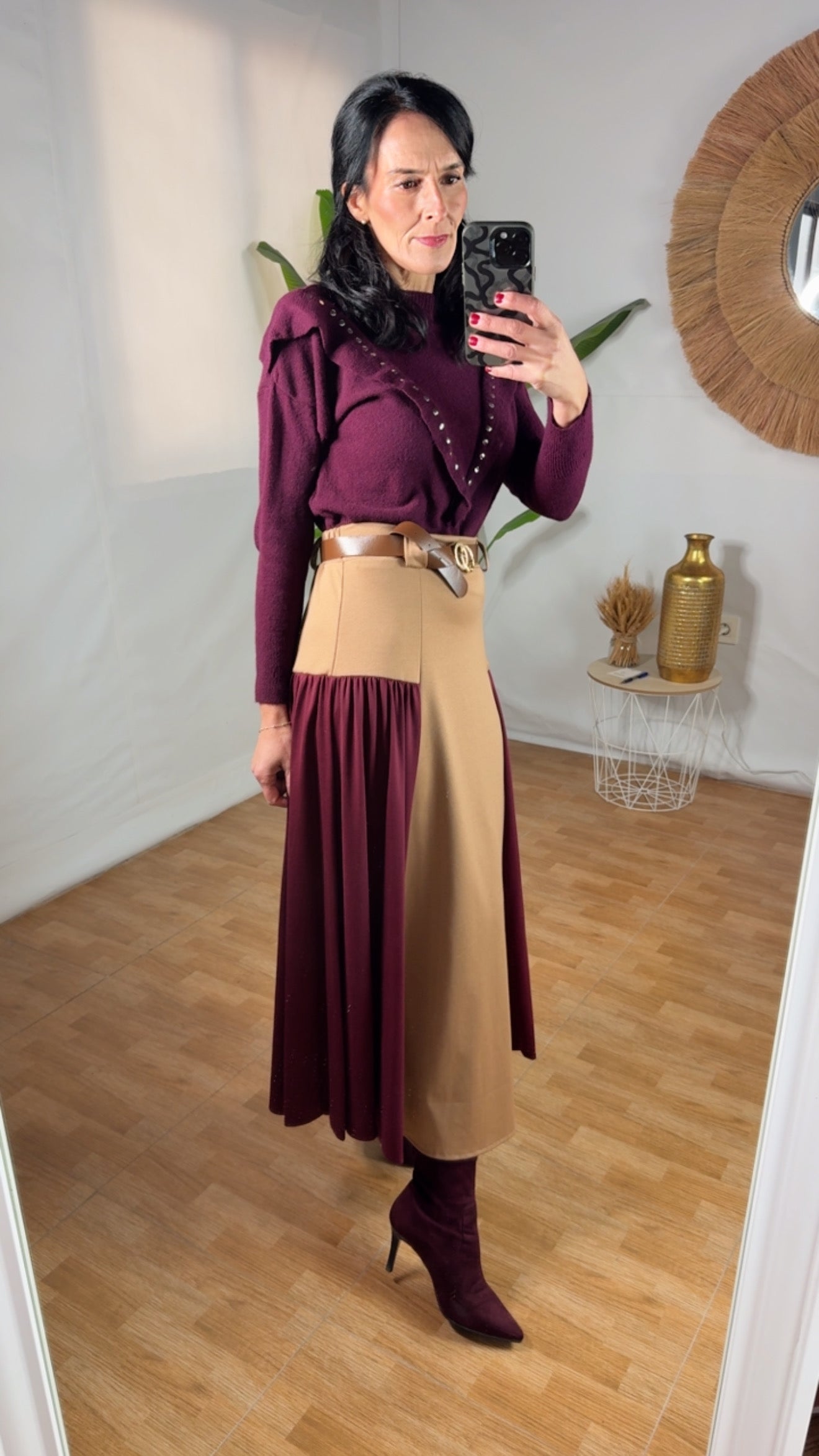 Esta falda midi destaca por su original diseño de paneles bicolor que combina un frente liso con laterales fruncidos para crear un movimiento elegante y sofisticado en cada paso mientras que su corte de tiro alto con trabillas permite ajustarla perfectamente a la cintura para estilizar la silueta siendo la prenda ideal para combinar con botas altas y jerséis entallados en cualquier ocasión especial o look de oficina moderno.