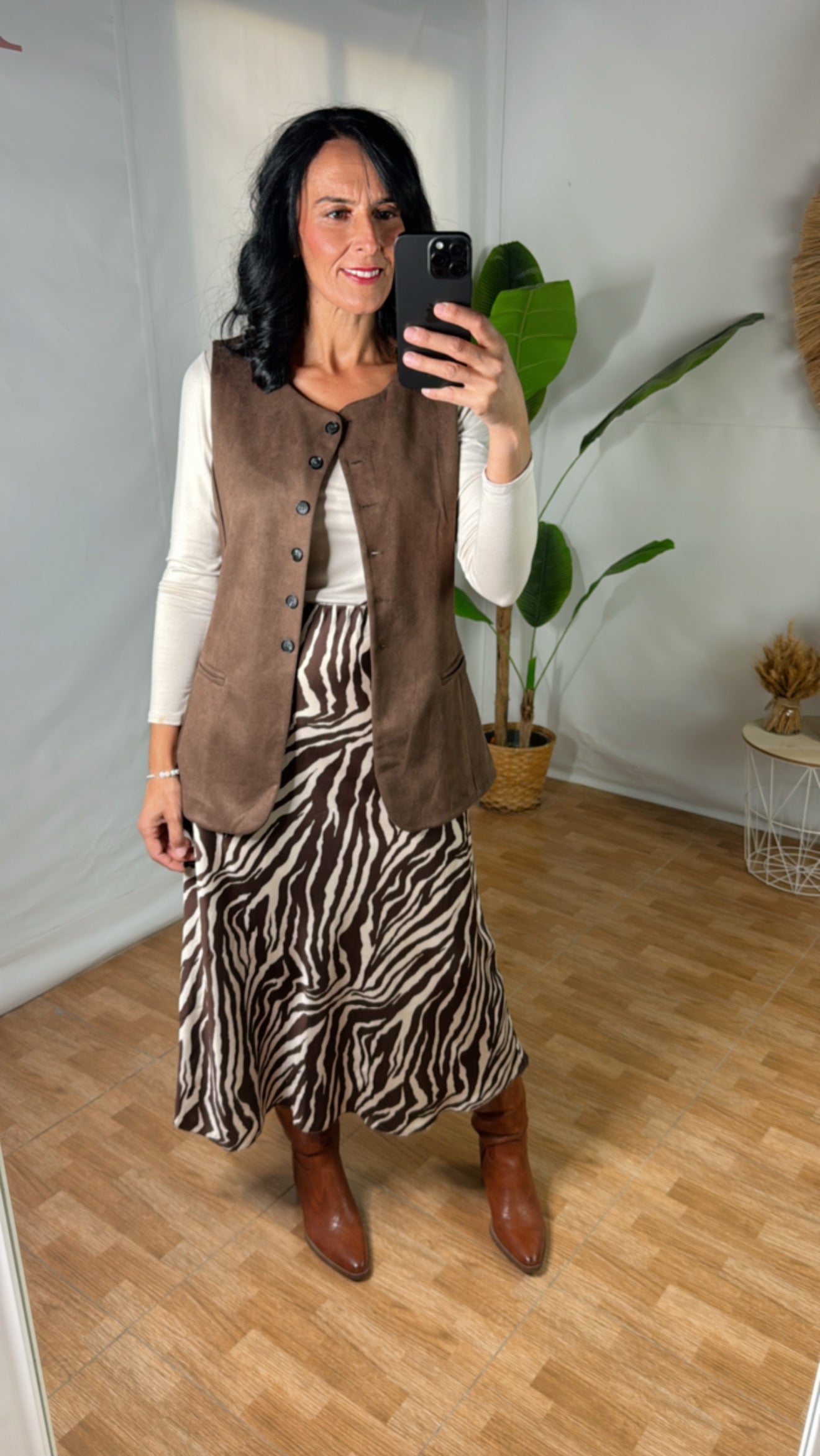 Atrévete con un clásico renovado. Esta falda midi con estampado animal print en tonos marrón y beige es pura sofisticación con un toque atrevido. Su tejido satinado aporta caída fluida y un brillo sutil que estiliza la silueta y convierte cualquier look en especial.