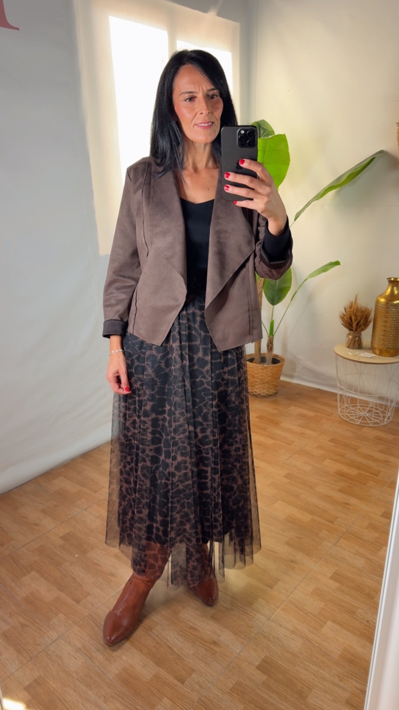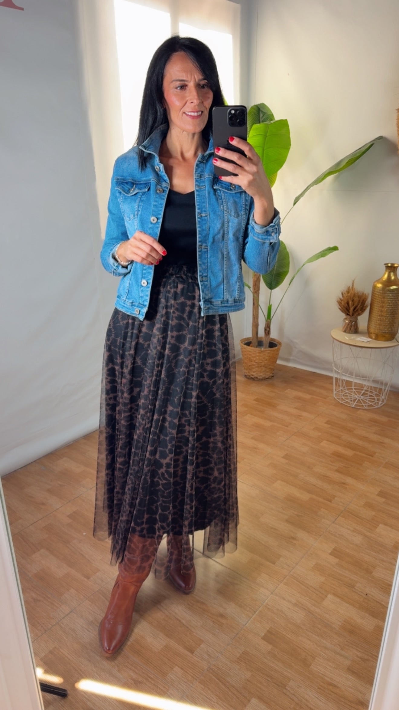 Dale un toque sofisticado y actual a tus looks con esta preciosa falda de tul con estampado animal print. Su tejido ligero y vaporoso aporta movimiento y elegancia, mientras que el forro interior opaco garantiza comodidad y seguridad al llevarla.