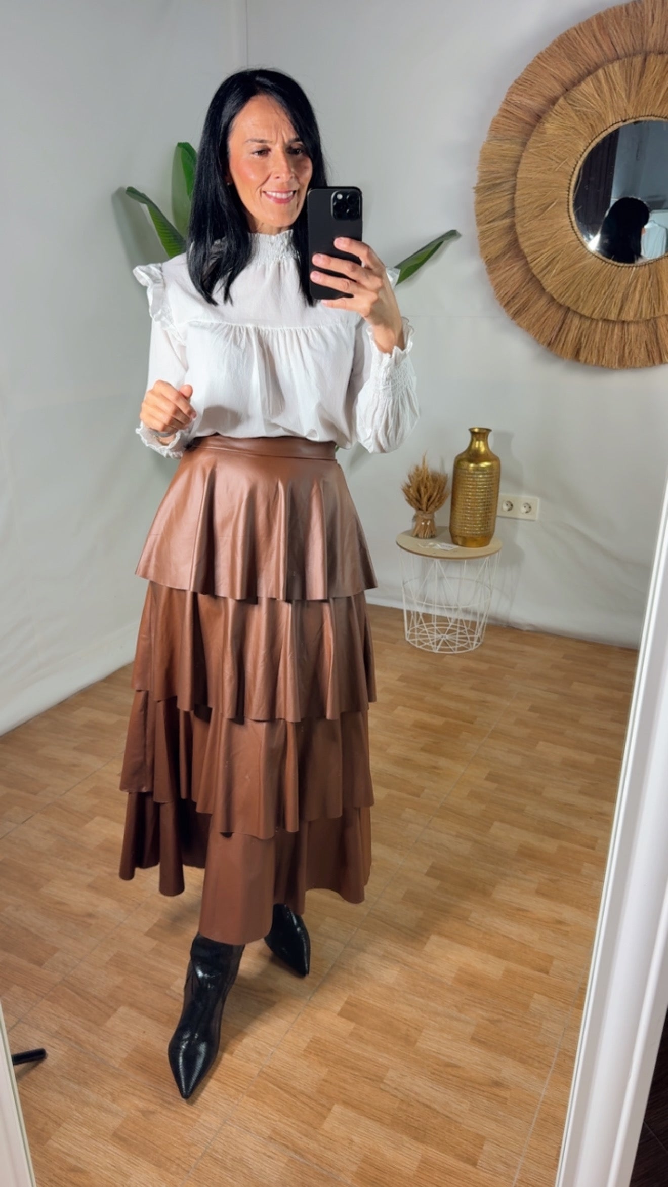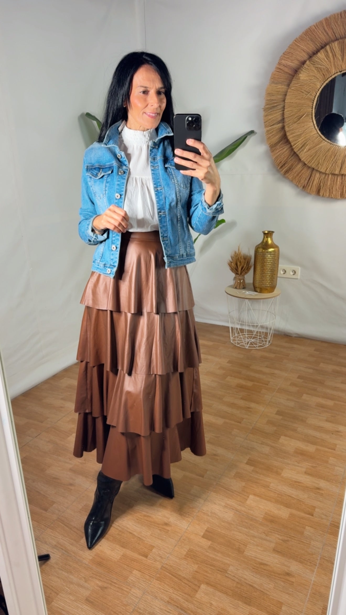 Esta falda de polipiel con tres volantes es perfecta para crear looks modernos y con personalidad. Su diseño con caída suave y acabado ligero aporta un toque actual sin perder comodidad.