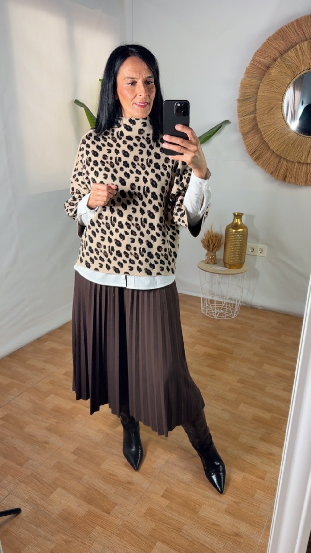 Diseño Versátil: Presenta un moderno y favorecedor estampado de leopardo en tonos neutros (beige y negro/marrón), fácil de combinar.