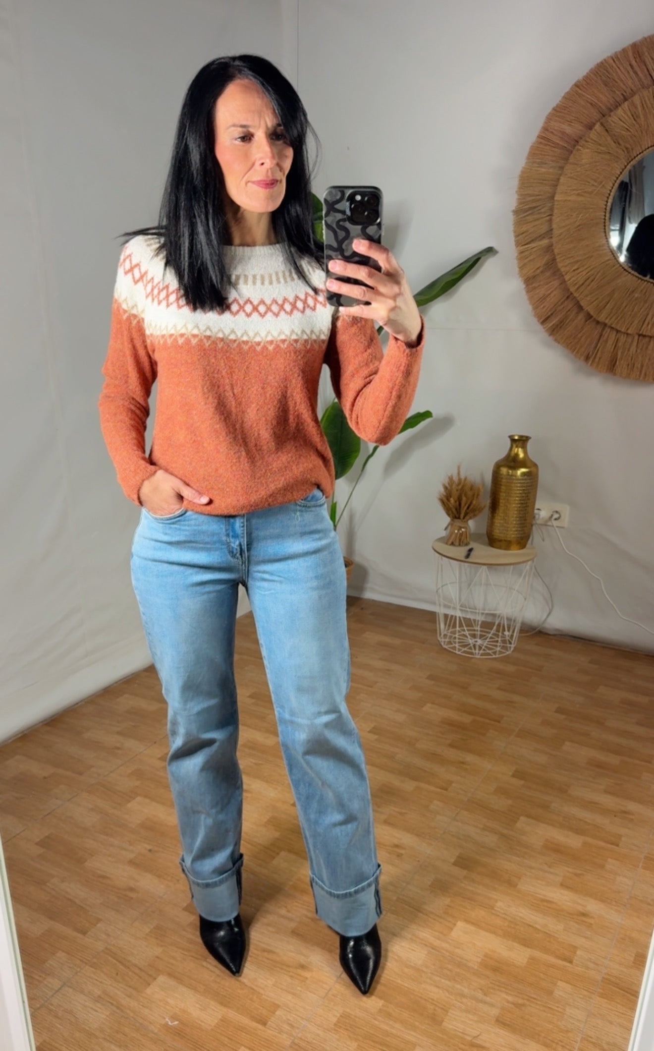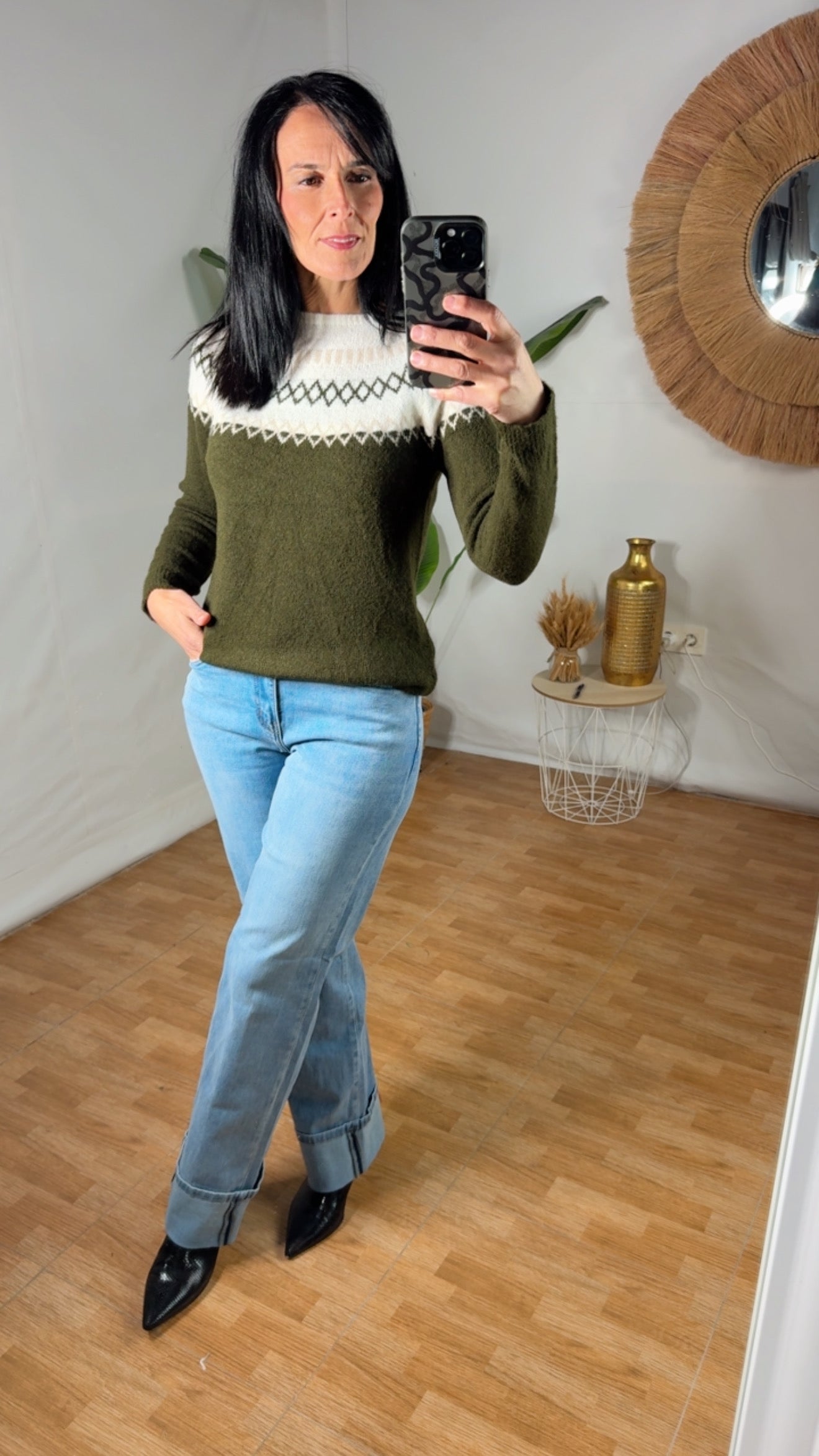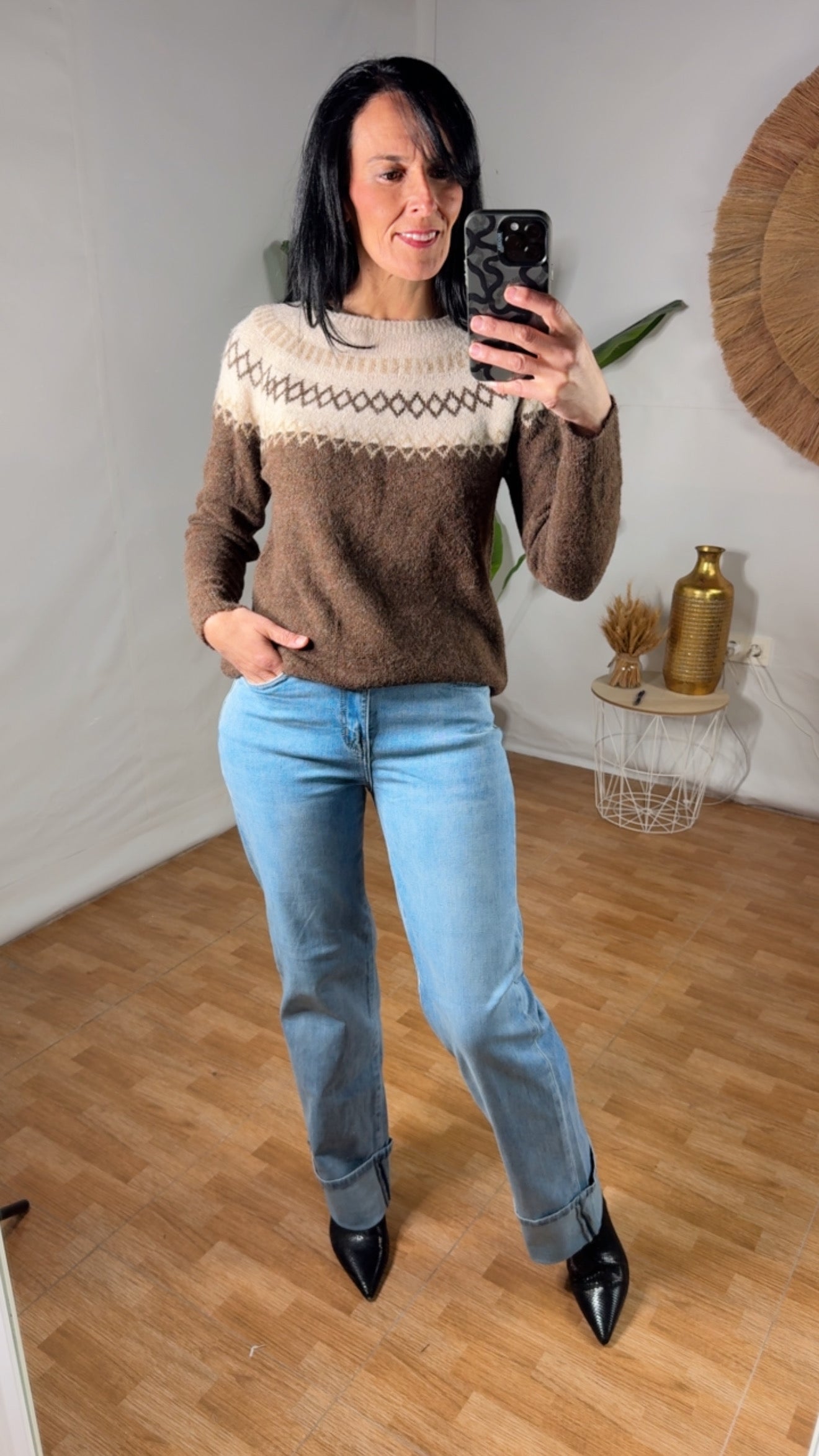 "El jersey perfecto para los días fríos. Inspirado en el clásico diseño nórdico, este jersey destaca por su preciosa cenefa geométrica en el pecho que ilumina el rostro. Su tejido suave y envolvente te ofrece la máxima comodidad sin perder estilo. Disponible en tres tonos inspirados en la naturaleza: tierra, verde bosque y caldera."