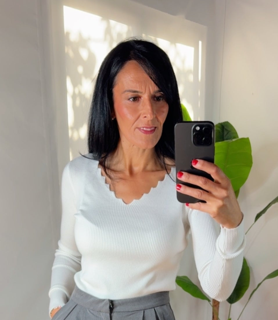 El detalle del escote en ondas aporta un toque delicado y elegante, ideal para combinar tanto con pantalones de vestir como con faldas o vaqueros.