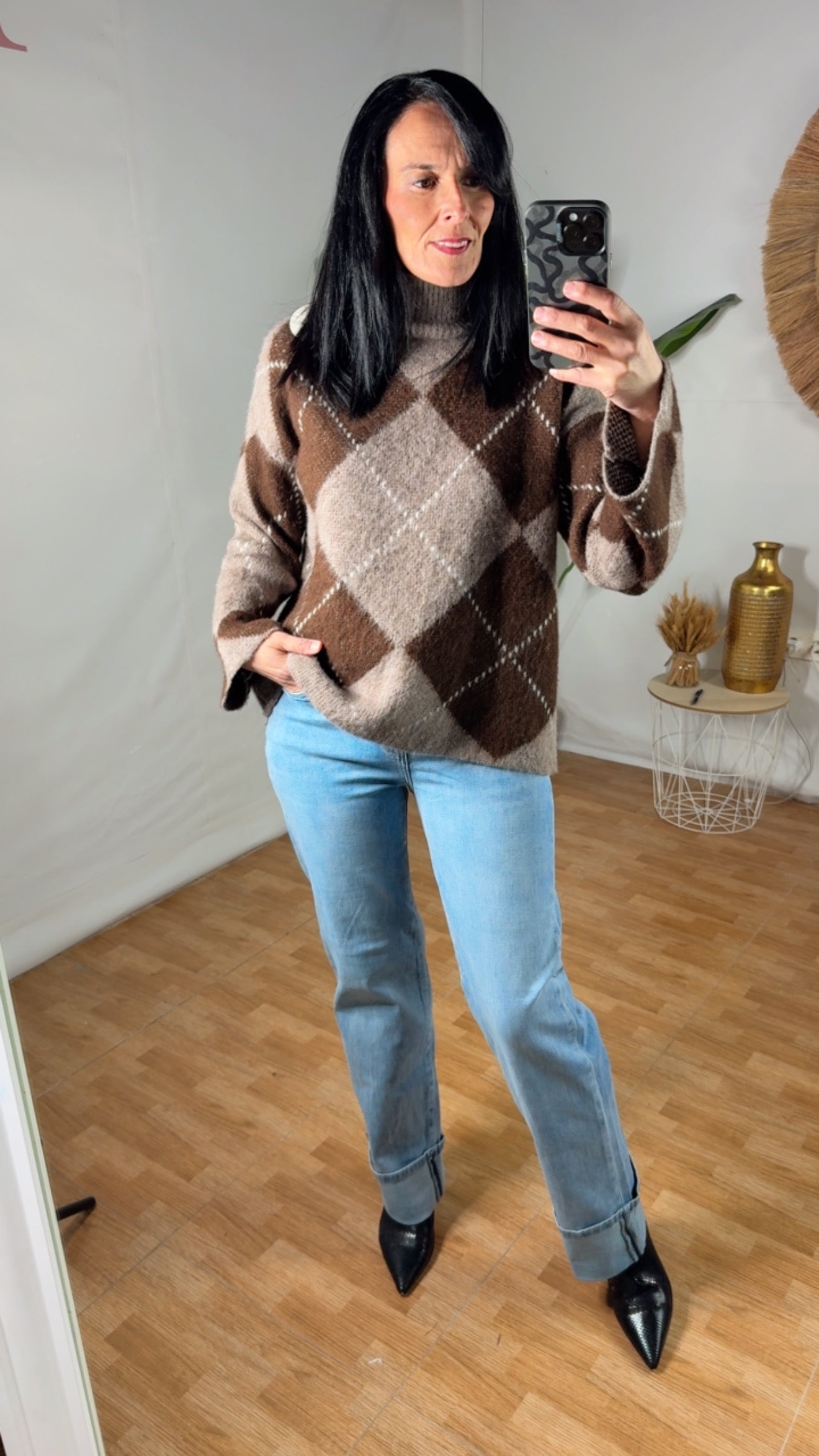 "El clásico estampado de rombos se renueva. Este jersey de cuello subido combina la estética preppy tradicional con un corte relajado y moderno. Su tejido suave y cálido lo convierte en la prenda estrella para combatir el frío con estilo. Disponible en dos combinaciones de tonos tierra muy fáciles de llevar."