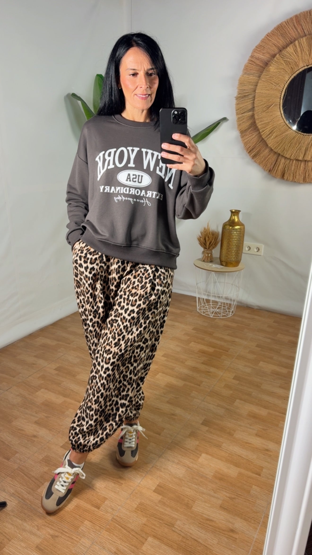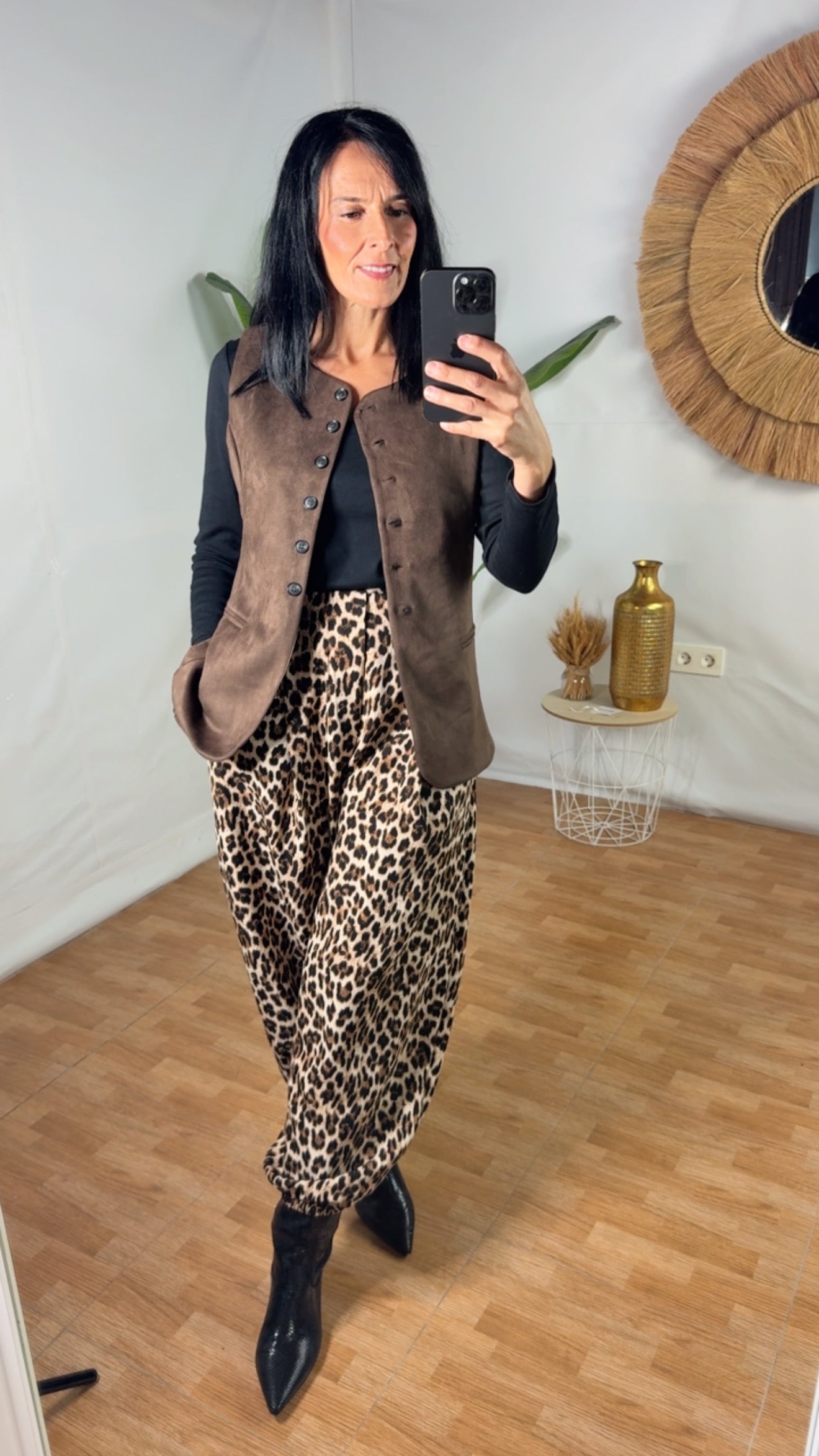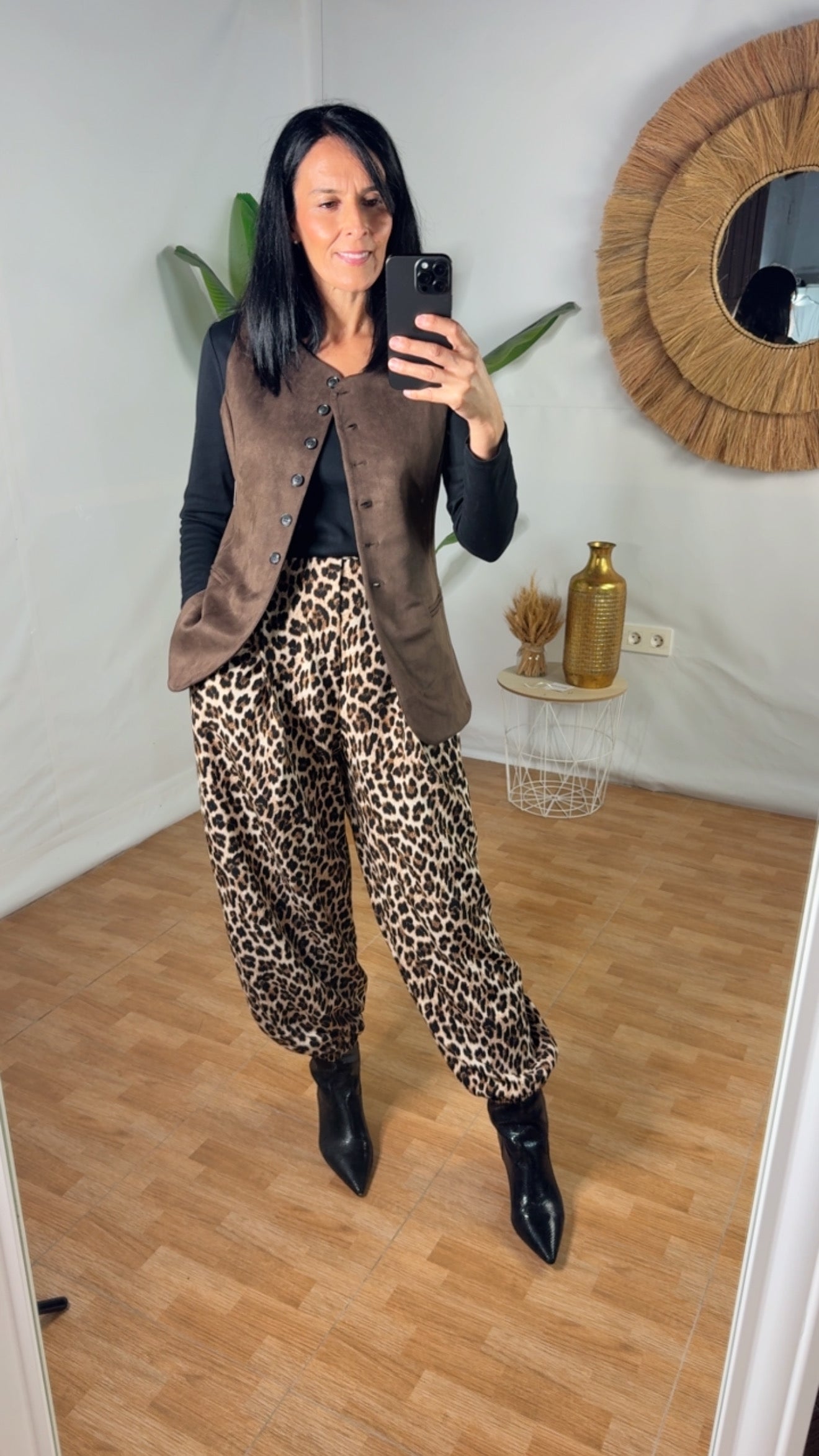Deslumbra con este espectacular pantalón estilo harem que combina la audacia del estampado leopardo con una comodidad inigualable. Su corte holgado y bajo engomado crea un efecto globo muy favorecedor que te permite moverte con total libertad sin renunciar al estilo.