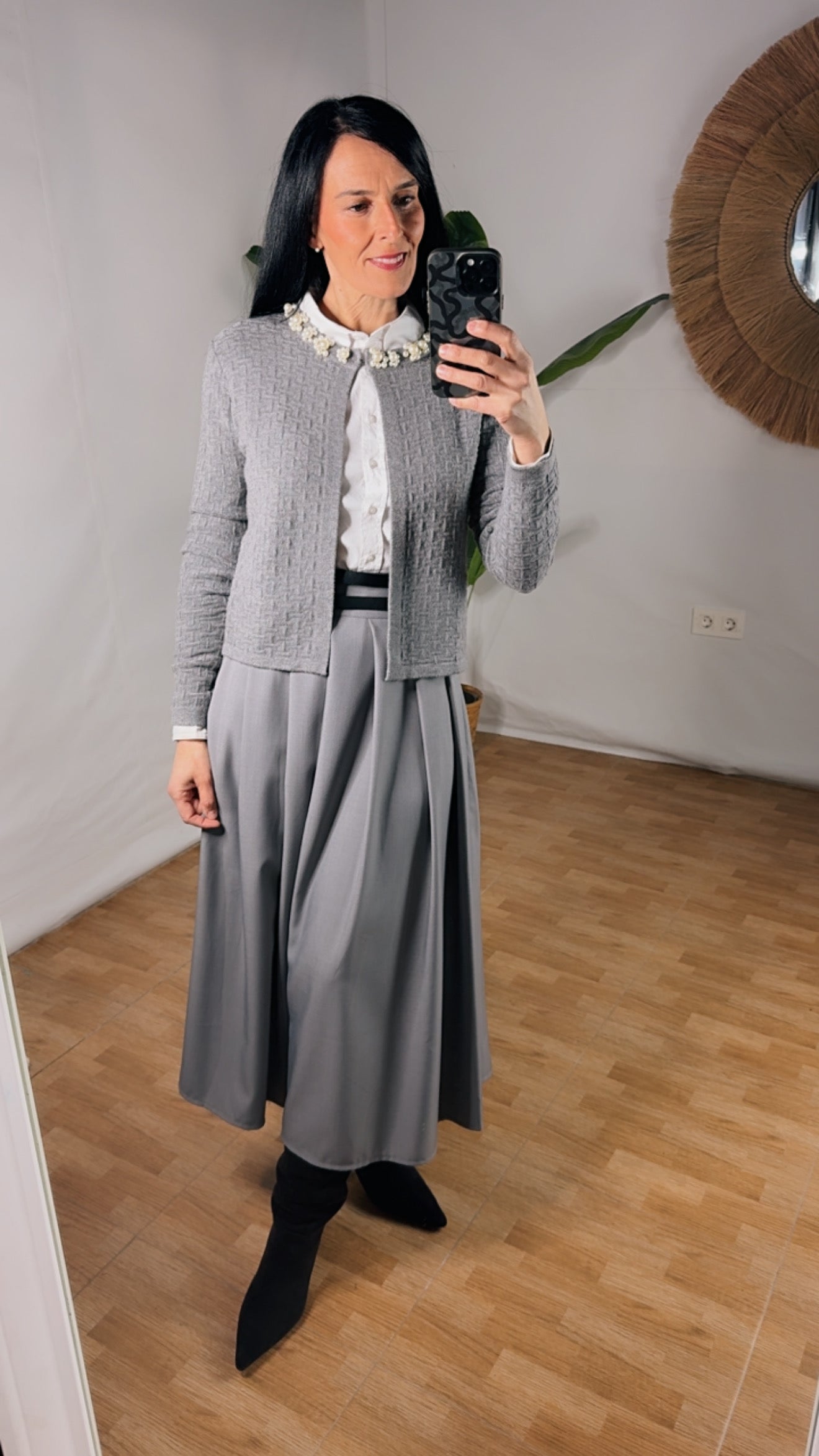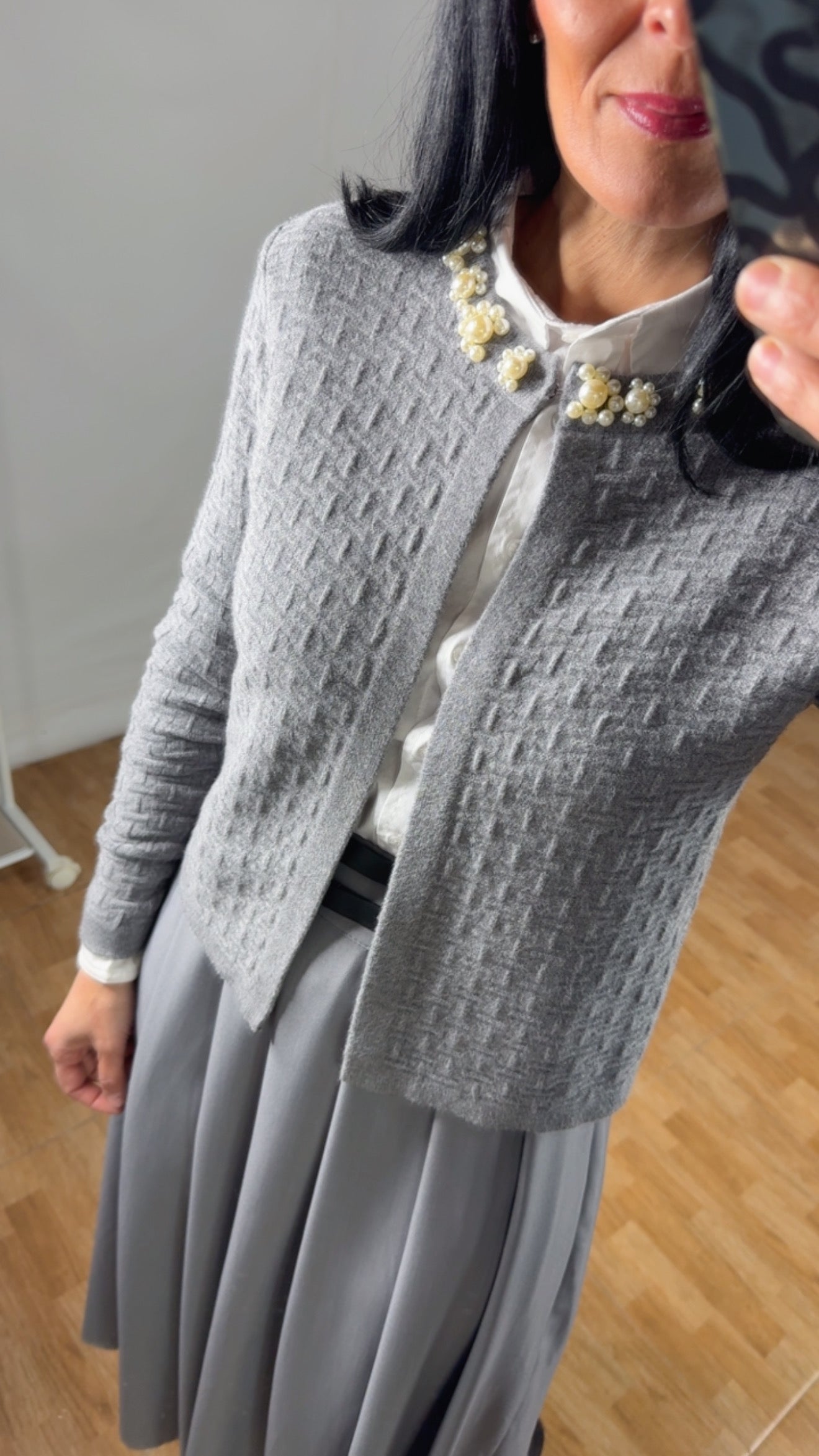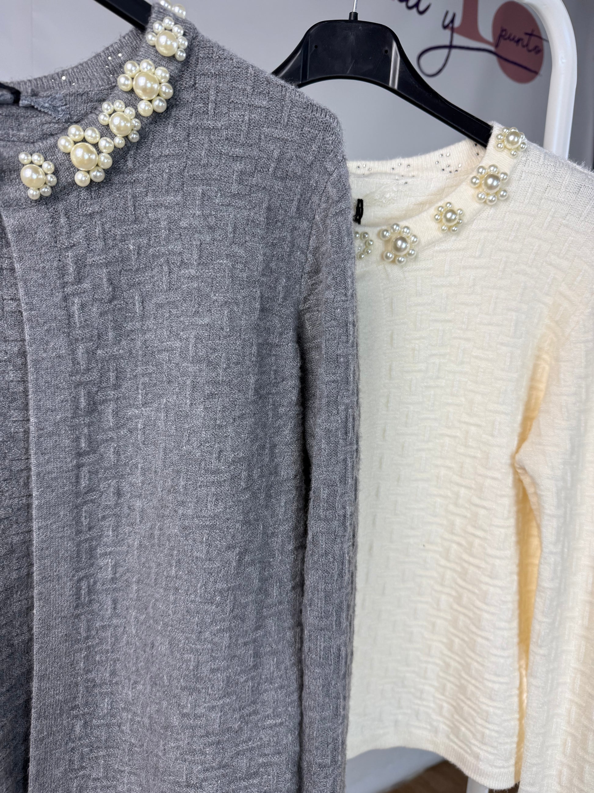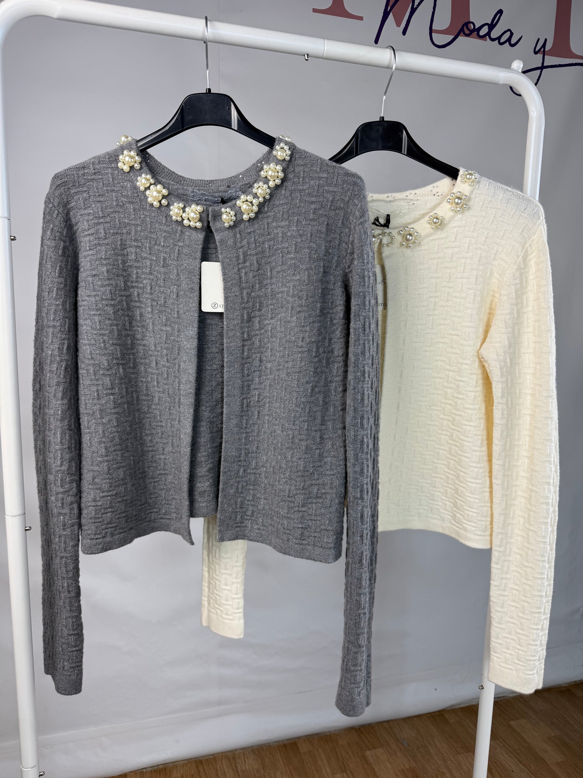 Añade un toque de distinción a tus looks con esta rebeca gris de textura suave y tejido encajado. Diseñada para mujeres que buscan elegancia sin esfuerzo, destaca por su cuello adornado con delicados apliques de perlas y cristales, creando un acabado refinado y femenino.