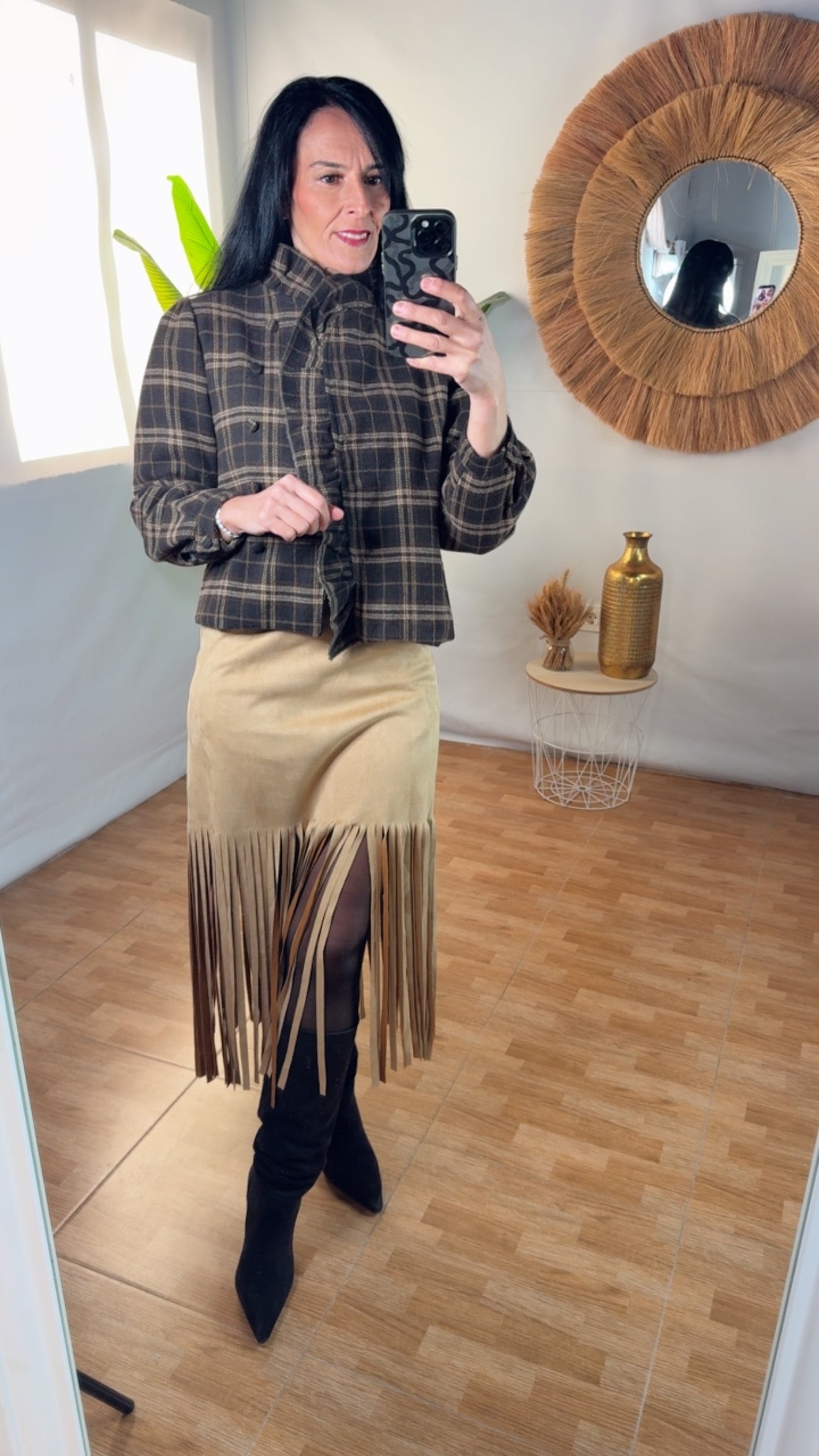 Vestido en de corte recto y silueta estilizada, confeccionado en tejido suave con acabado tipo ante. Su diseño se distingue por el detalle de flecos en el bajo, que aporta dinamismo y un toque elegante y actual.